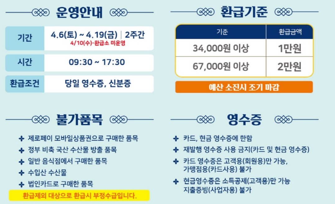 - 환급금액은 구매금액이 3만 4천 원 이상일 경우는 1만 원 환급, 구매금액이 6만 7천 원 이상이면 2만 원 환급입니다.