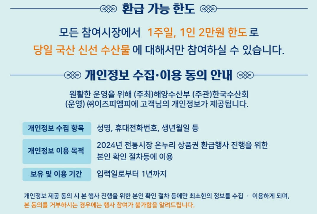 - 전통시장에서 수산물을 구매한 후 구매 영수증과 신분증을 지참하여 시장에 있는 환급부스를 방문합니다. 그러면 온누리상품권으로 구매금액의 일부를 환급받으실 수 있습니다.