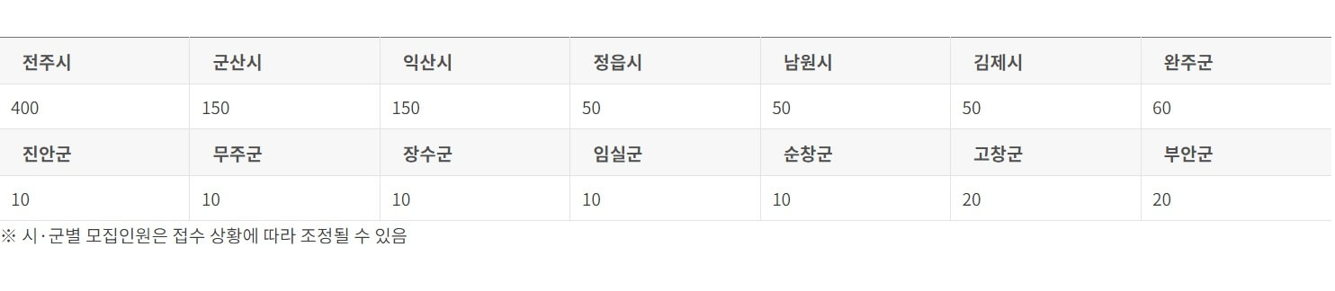 - 선정 인원 : 1000명(시, 군별 모집인원은 접수상황에 따라 조정될 수 있습니다.)