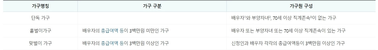 가구원 구성에 따라 연간 부부합산 총소득금액이 기준금액( 단독 2,200만 원, 홑벌이가구 3,200만 원, 맞벌이가구 3,800만 원 ) 미만이어야 합니다.