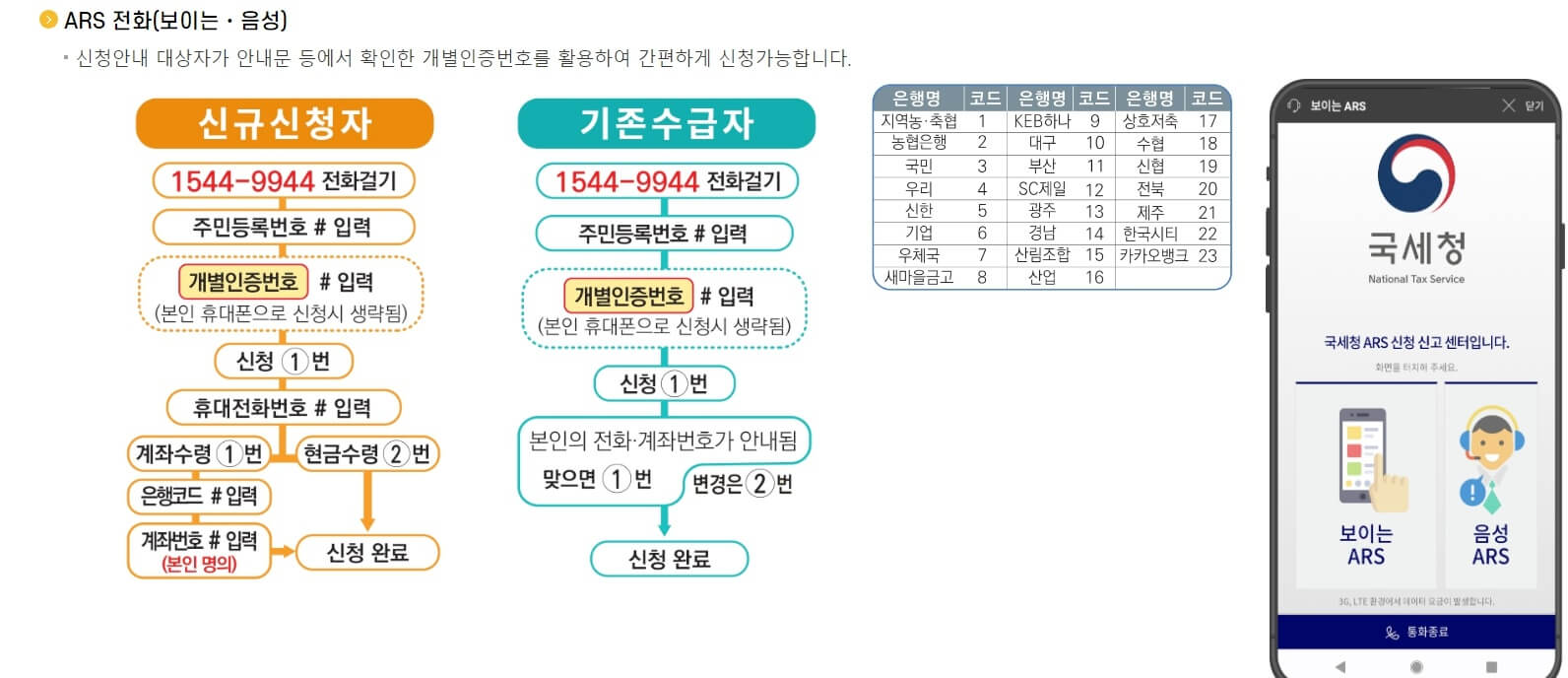 전화(정기신청 시 해당)로 주민등록번호 13자리를 눌러 신청을 선택하고, 신청안내문(문자메시지)에 기재된 개별 인증번호 8자리를 입력하고 안내에 따라 신청합니다. - 홈택스(모바일, pc)로 신청하기