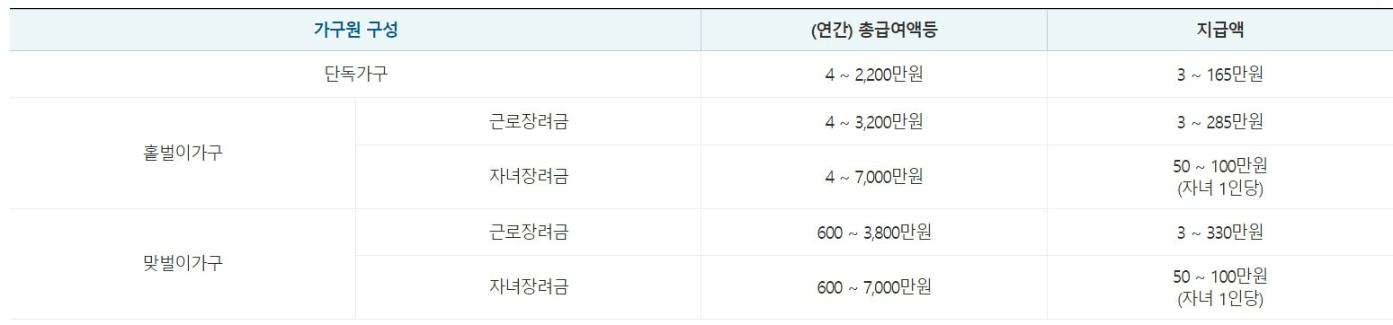 2024 근로장려금 지급액은 연간 부부합산 총 급여액 등을 기준으로 산정하여 반영됩니다.