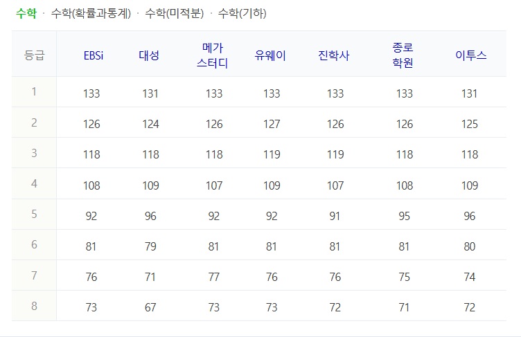 다음은 각 학원에서 발표한 2025 수능 수학 예상 등급컷입니다.